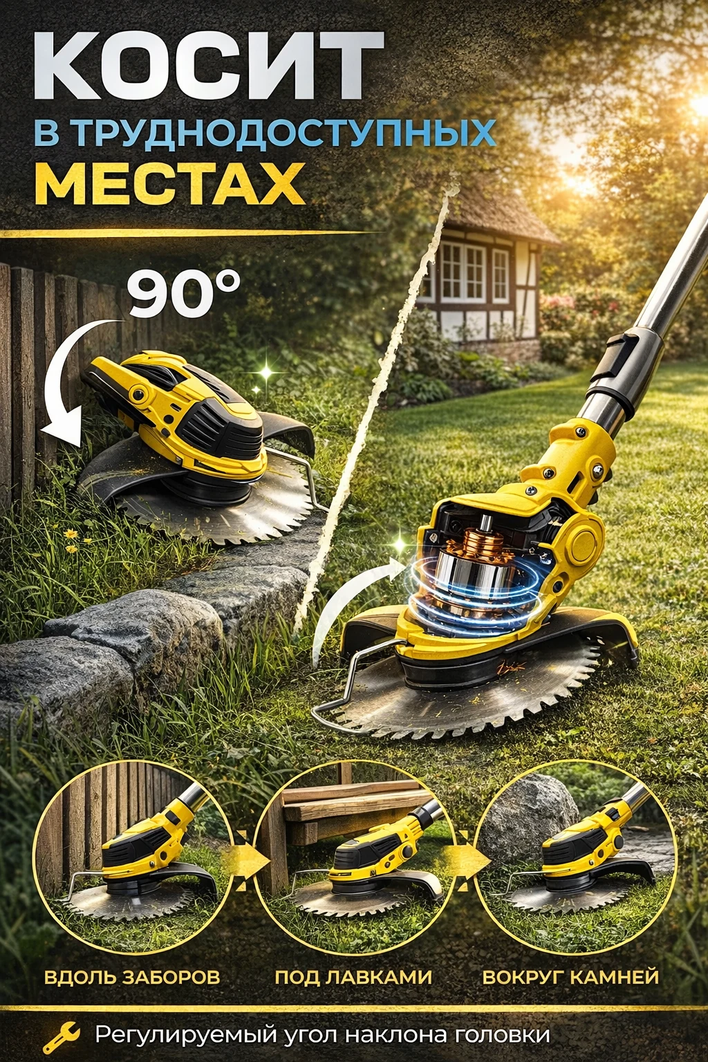 Триммер удобно использовать там, где обычной газонокосилке тесно: вдоль бордюров, у ступеней, вокруг деревьев и в узких проходах. Регулируемая штанга и сменные насадки помогают настроить инструмент под разные задачи и работать аккуратно без лишней нагрузки на руки.
